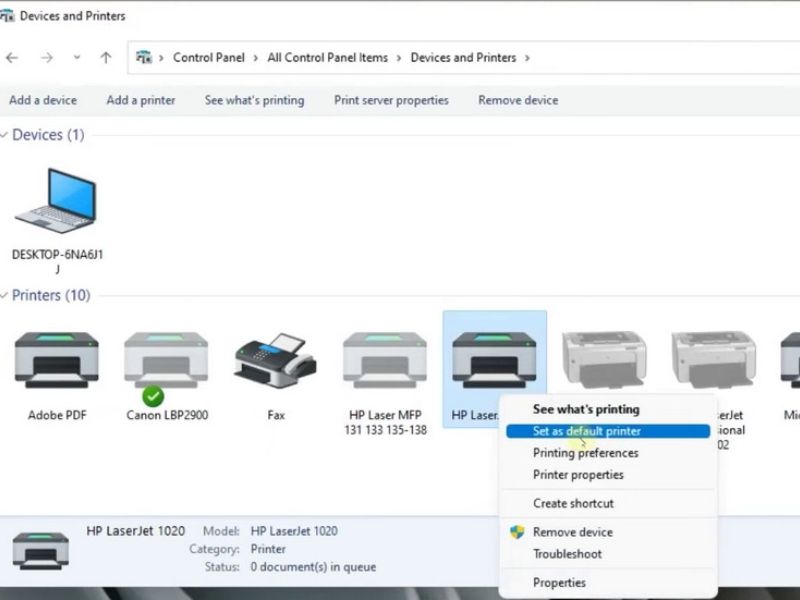 - Truy cập Control Panel, vào Devices and Printers, kiểm tra tên máy in trong danh sách. Để thiết lập máy in mặc định, nhấp chuột phải vào máy in và chọn Set as default printer.